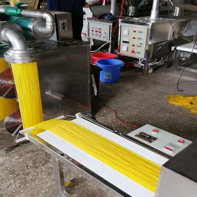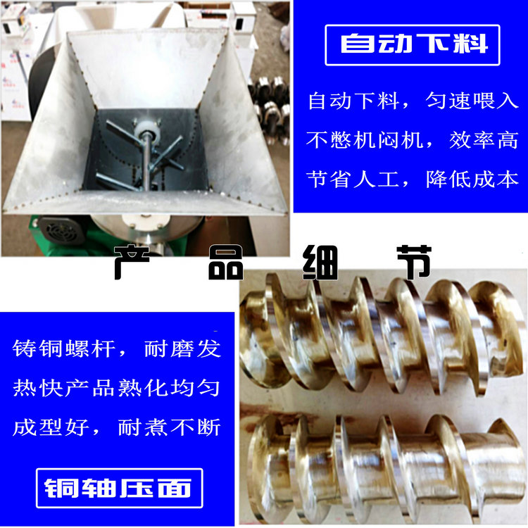 天華自熟冷面機(牛筋面機)結構合理,造型美觀,由自動下料器、雙銅軸壓面機、數(shù)控切斷機組成,自動下料器由調速電機帶動,通過快慢速度調整喂料的多少,壓面機采用螺旋擠壓生物變性工藝,無需外加熱源,利用軸筒旋轉與原料摩擦揉擠產(chǎn)生的熱能,使原料到成品一次熟化成型,將玉米面、蕎麥面、小麥面等雜糧面通過冷面機綜合轉化成具有柔韌彈性特點的風味面食,更換不同的的模具可以加工不同粗細寬窄的形狀,產(chǎn)品外表光滑、柔軟可口、久煮不糊,保留原糧的特有營養(yǎng)成分和微量元素。自熟冷面機還可生產(chǎn)鋼絲面、牛筋面及各種雜糧面條等。成型的面食進入調速皮帶輸送機,由延時控制切斷裝置把面條切成所需的長短后即可包裝銷售。